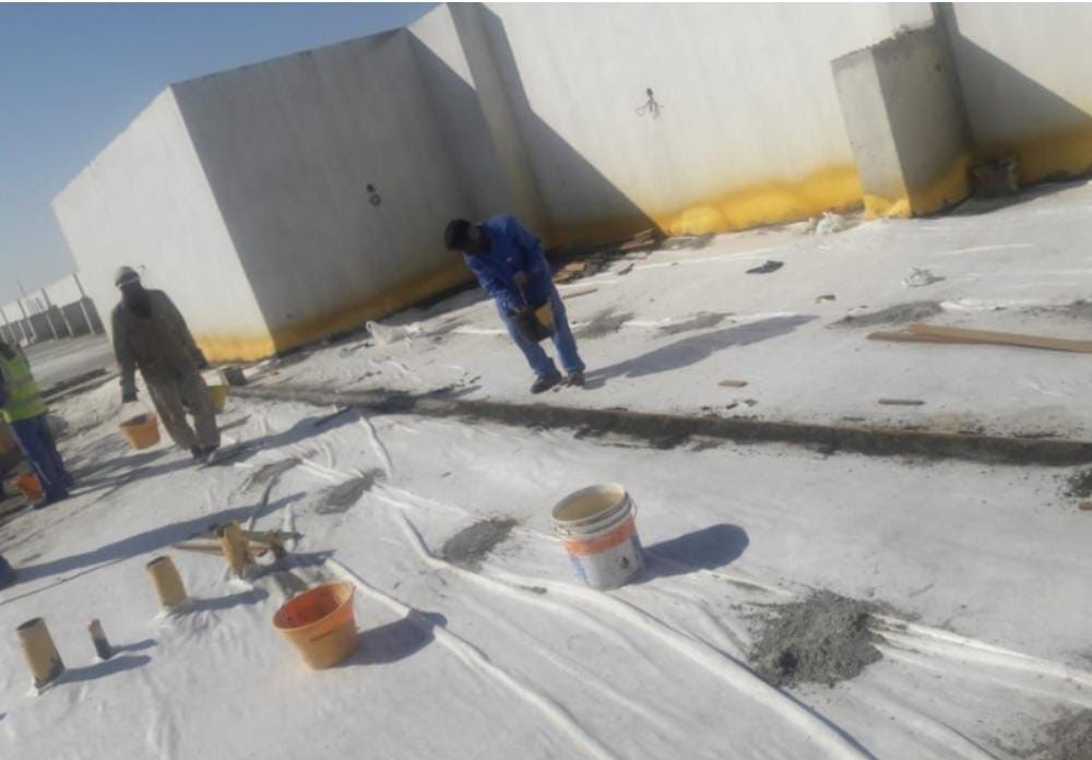 After the completion of the joint’s treatment, curing of the applied angle fillet and the casted screed, saturate the concrete surface with clean water. Two coats of cementitious coating Polyplex (White) will be applied above the surface to avoid the dampness of the substrate. The applied final coat will be allowed to fully cure for 7 days before allowing any traffic on the roof. The topcoat will give an aesthetic appearance to the roof.