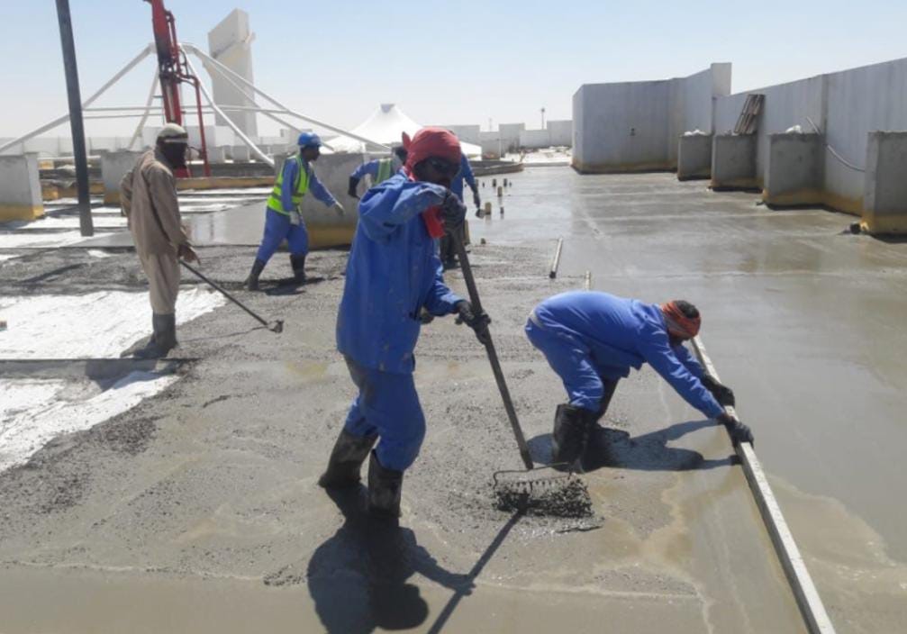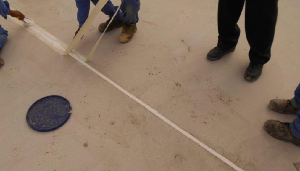After the completion of the joint’s treatment, curing of the applied angle fillet and the casted screed, saturate the concrete surface with clean water. Two coats of cementitious coating Polyplex (White) will be applied above the surface to avoid the dampness of the substrate. The applied final coat will be allowed to fully cure for 7 days before allowing any traffic on the roof. The topcoat will give an aesthetic appearance to the roof.
